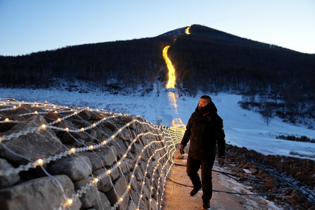 12月30日,工作人員在崇禮長城景觀展示亮化工程現(xiàn)場巡查。新華社記者 牟宇 攝