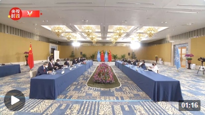 △會(huì)見現(xiàn)場(chǎng)的中國(guó)國(guó)旗和聯(lián)合國(guó)旗幟。(總臺(tái)央視記者荊偉拍攝)