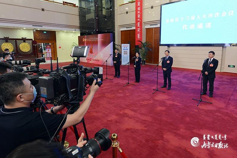 1月27日晚,自治區(qū)十三屆人大四次會(huì)議“代表通道”集中采訪活動(dòng)在內(nèi)蒙古人民會(huì)堂玻璃廳舉行,8位人大代表分兩組“亮相”。這是自治區(qū)人大首次開(kāi)通“代表通道”。圖為人大代表樸成奎、胡成東、云霖瓊和李全文4位代表(從左至右)回答記者提問(wèn)。內(nèi)蒙古日?qǐng)?bào)記者 金泉 攝