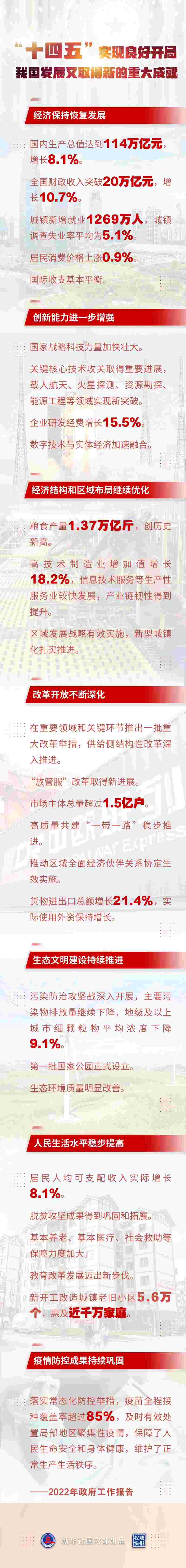 ——改革開放不斷深化。在重要領(lǐng)域和關(guān)鍵環(huán)節(jié)推出一批重大改革舉措,供給側(cè)結(jié)構(gòu)性改革深入推進(jìn)?!胺殴芊备母锶〉眯逻M(jìn)展。市場(chǎng)主體總量超過1.5億戶。高質(zhì)量共建“一帶一路”穩(wěn)步推進(jìn)。推動(dòng)區(qū)域全面經(jīng)濟(jì)伙伴關(guān)系協(xié)定生效實(shí)施。貨物進(jìn)出口總額增長(zhǎng)21.4%,實(shí)際使用外資保持增長(zhǎng)。