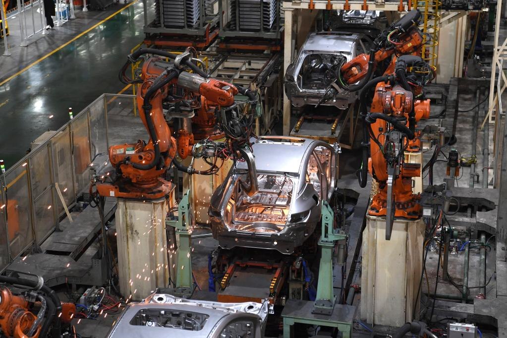 工業(yè)機(jī)器人在江淮汽車(chē)乘用車(chē)焊接車(chē)間生產(chǎn)線上工作(2月22日攝)。新華社記者 劉軍喜 攝
