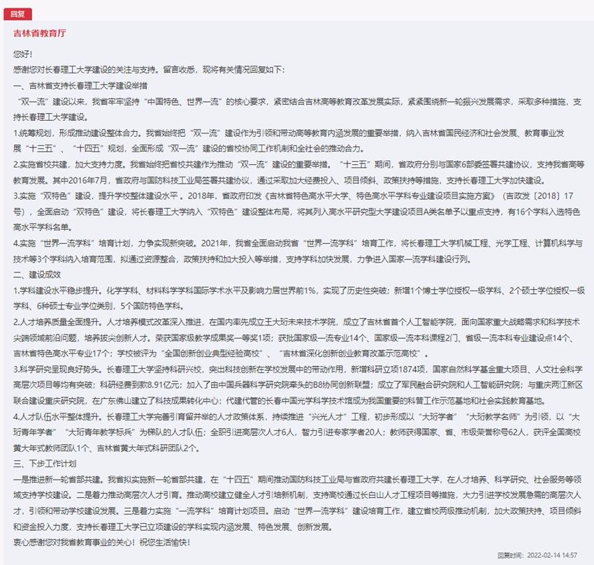 吉林省教育廳回復(fù)了網(wǎng)友的留言,并對吉林省高校建設(shè)工作進行了詳細(xì)闡述。