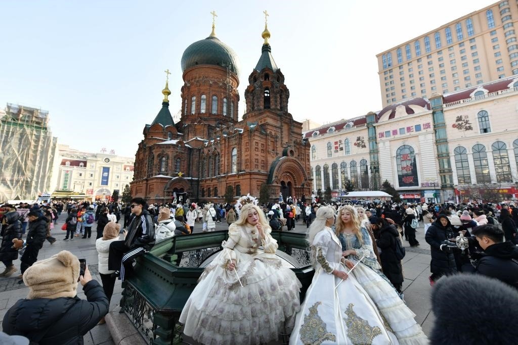 2月12日,旅拍游客在哈爾濱建筑藝術(shù)廣場身著盛裝拍照。(新華社記者王建威攝)