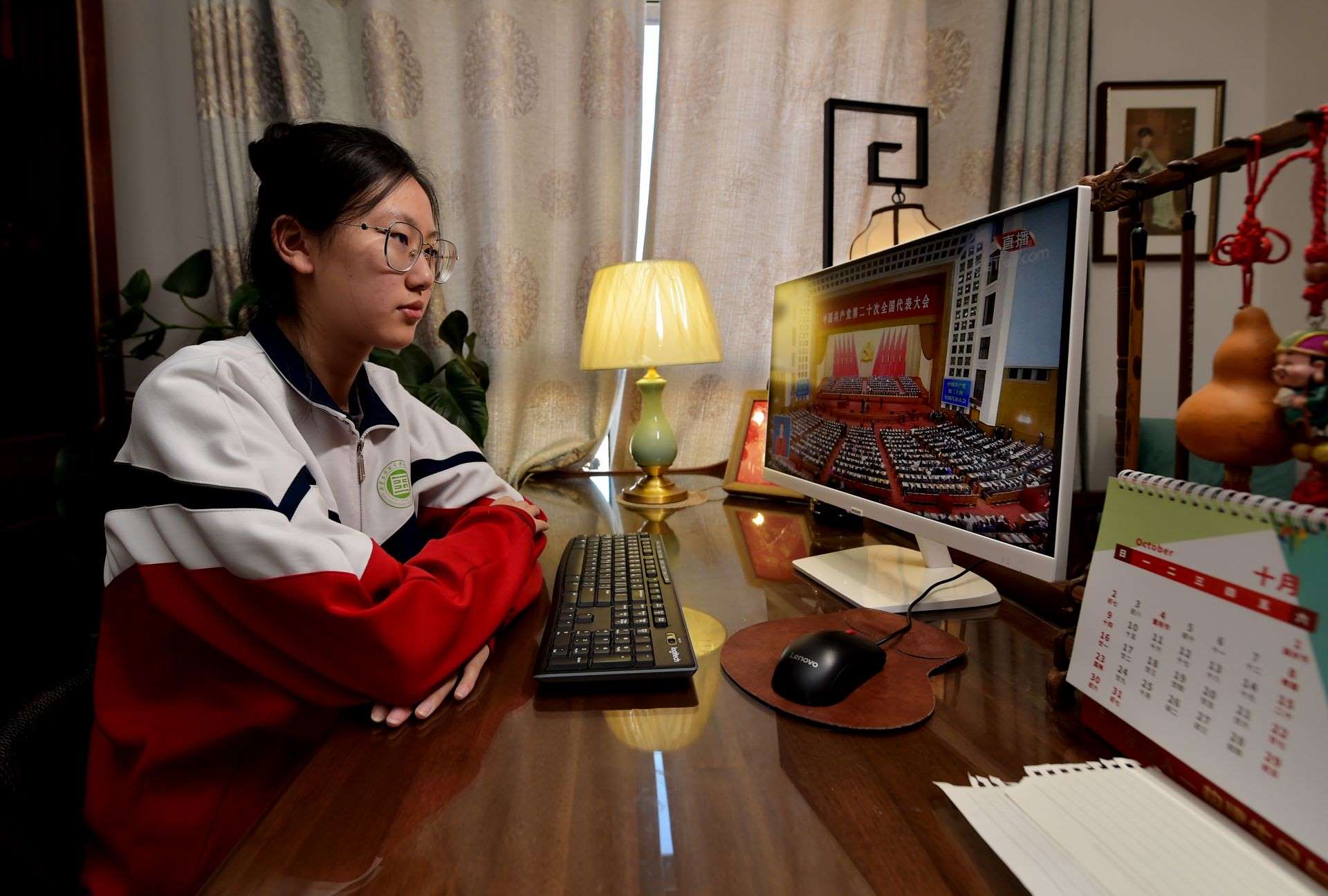內(nèi)蒙古師范大學(xué)附屬第二中學(xué)的學(xué)生蒙納收看黨的二十大開(kāi)幕會(huì)。本報(bào)記者馬建荃攝