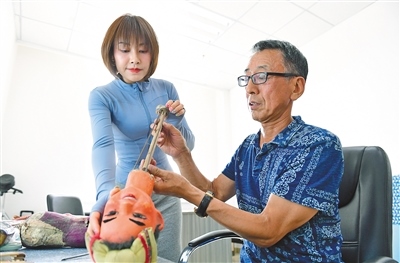 靳媛在原呼和浩特市玉泉區(qū)木偶劇團演員張曉紅(右)指導下修復木偶。