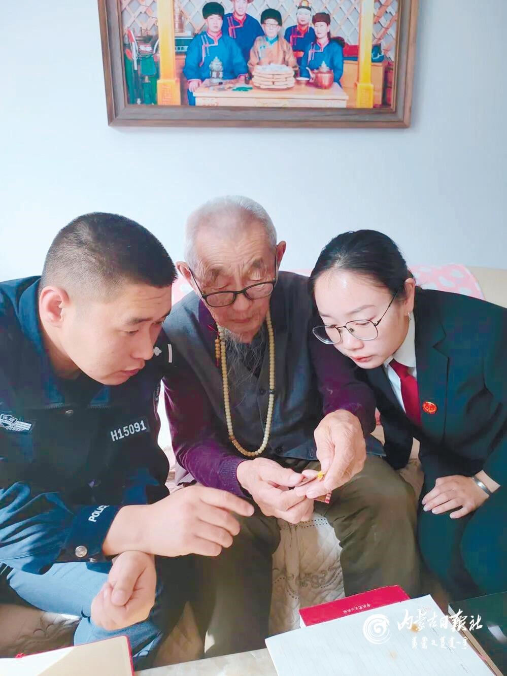老黨員為青年干警介紹自己獲得的勛章。近日,錫林郭勒盟蘇尼特左旗人民法院組織青年干警來到91歲的老黨員阿日德那巴吉爾家中,聆聽老人講述黨史故事,接受革命傳統(tǒng)教育。(內(nèi)蒙古日報(bào)記者 李晗 攝)