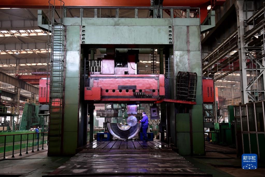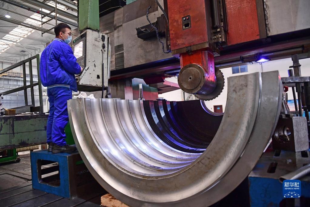 2020年3月16日,在沈陽鼓風機集團股份有限公司生產車間,工人操作機器加工產品內機殼。新華社記者 楊青 攝