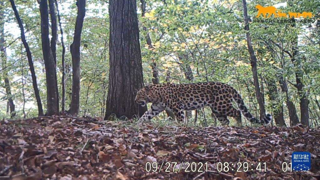這是2021年9月27日利用“天地空一體化監(jiān)測系統(tǒng)”在東北虎豹國家公園內監(jiān)測到的野生東北豹影像(視頻截圖)。新華社發(fā)